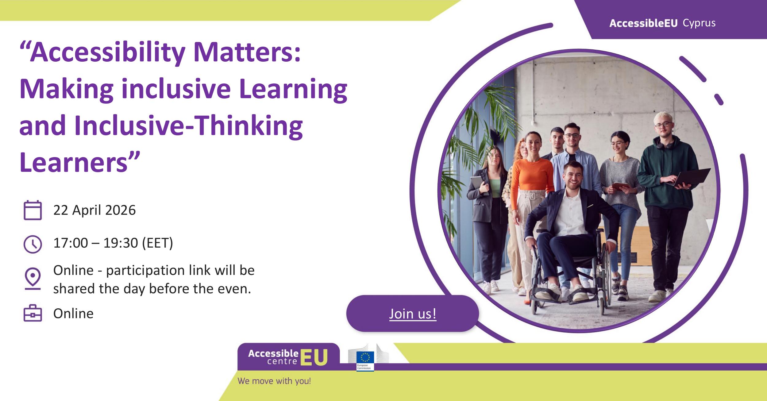 The online workshop is entitled “Accessibility Matters: Making Inclusive Learning and Inclusive Thinking Learners”, hosted by European University Cyprus under the AccessibleEU Centre, in collaboration with the Cyprus University of Technology. The event is organized within the framework of the Nicosia Declaration, which was launched at EUC in September 2025.