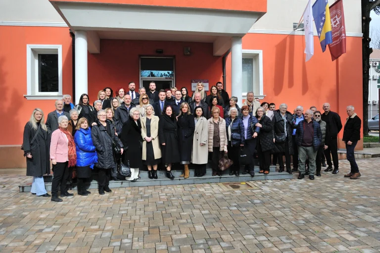 The program commenced with a formal reception for retired University employees, expressing gratitude to the generations whose dedicated work contributed to the institution’s growth. On the same day, floral tributes were laid at the memorial bust of Dzemal Bijedic and the memorial of Midhad Hujdur Hujka, honoring these historical figures of Mostar and Bosnia and Herzegovina.